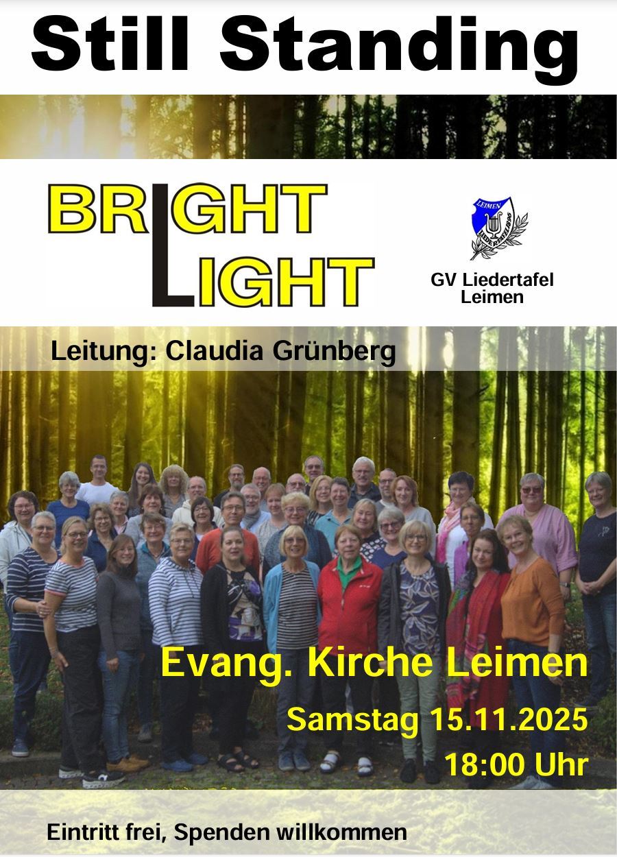 Wir freuen uns sehr, Sie zu unserem kommenden Chorkonzert einzuladen. Seien Sie dabei, wenn der Chor Bright Light der Liedertafel Leimen unter der Leitung von Claudia Grünberg am 15.11.2025 um 18:00 Uhr in der evangelischen Kirche Leimen auf der Bühne steht.